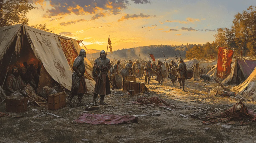 As the battle progressed, Duke Odo initiated a pivotal flanking manoeuvre that shifted the balance in favor of the Franks. He sent his cavalry on a wide flank, reaching the distant Muslim encampment, where the Umayyad tents and their abundant plunder from the recent sacking of Bordeaux were located.