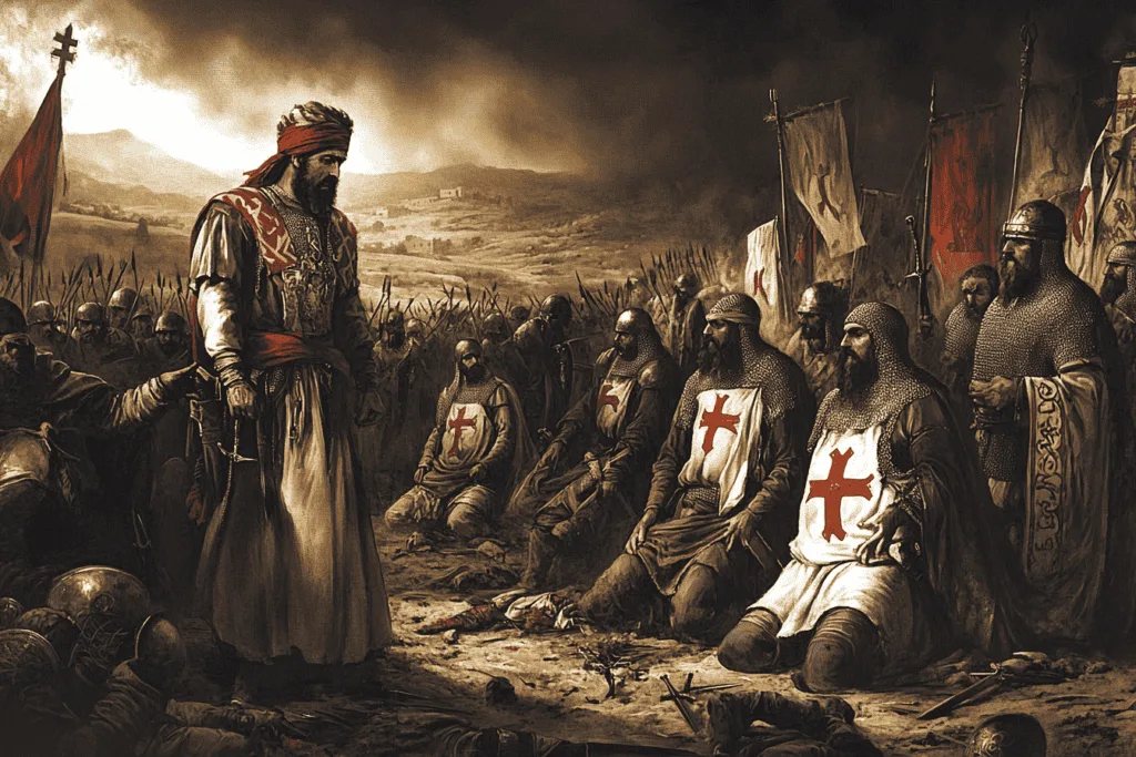 Overwhelmed by thirst, exhaustion, and the relentless attacks of Saladin’s forces, the Crusader army collapsed. By midday, the battle was over. King Guy and the surviving nobles surrendered, while thousands of foot soldiers were slaughtered or enslaved. In the final stages of the battle, Saladin’s forces captured most of the Crusader nobility, including King Guy of Lusignan and Raynald of ChĆ¢tillon.
