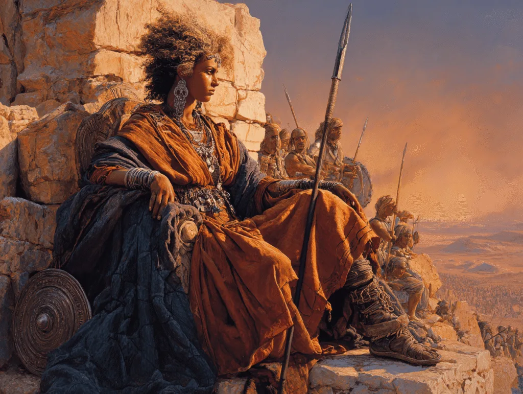 When the Arab general Hassan ibn al-Nu’man advanced after conquering Carthage, al-Kahina responded decisively. She demolished the town of Baghaya to deny the Arabs a strategic base, then confronted Hassan’s army near the Meskiana River in 696. Her forces launched a fierce attack, inflicting heavy casualties and forcing the Arabs into a major retreat – so severe that Arab chronicles named the site “wadi al-balaa’,” or the river of disaster. This victory allowed her to expand her control over large parts of Ifriqiya and rule as the most powerful monarch in North Africa for several years.