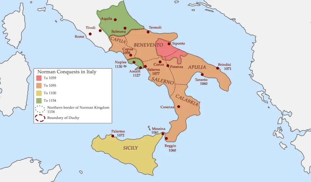 In contrast to the Norman Conquest of England in 1066, which resulted from a single decisive battle within a few years, the conquest of southern Italy unfolded over several decades and involved numerous battles, few of which were truly decisive. Many territories were initially conquered independently and only later came together to form a unified state. While the conquest of southern Italy was more unplanned and disorganized compared to that of England, it was equally thorough in its outcome.