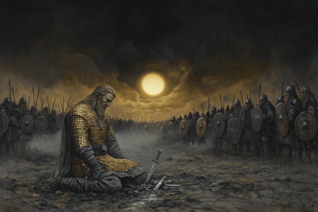 The battle’s turning point came as the sky turned “dark as night” – likely a reference to the solar eclipse now dated to August 31, 1030. Amidst the chaos, Olaf was struck down, reportedly uttering the words, “God help me,” as he died. His banner-bearer Thord Folason planted the serpent standard defiantly before falling, while Olaf’s teenage half-brother Harald (later Hardrada) narrowly survived, foreshadowing his own legendary fate at Stamford Bridge in 1066.