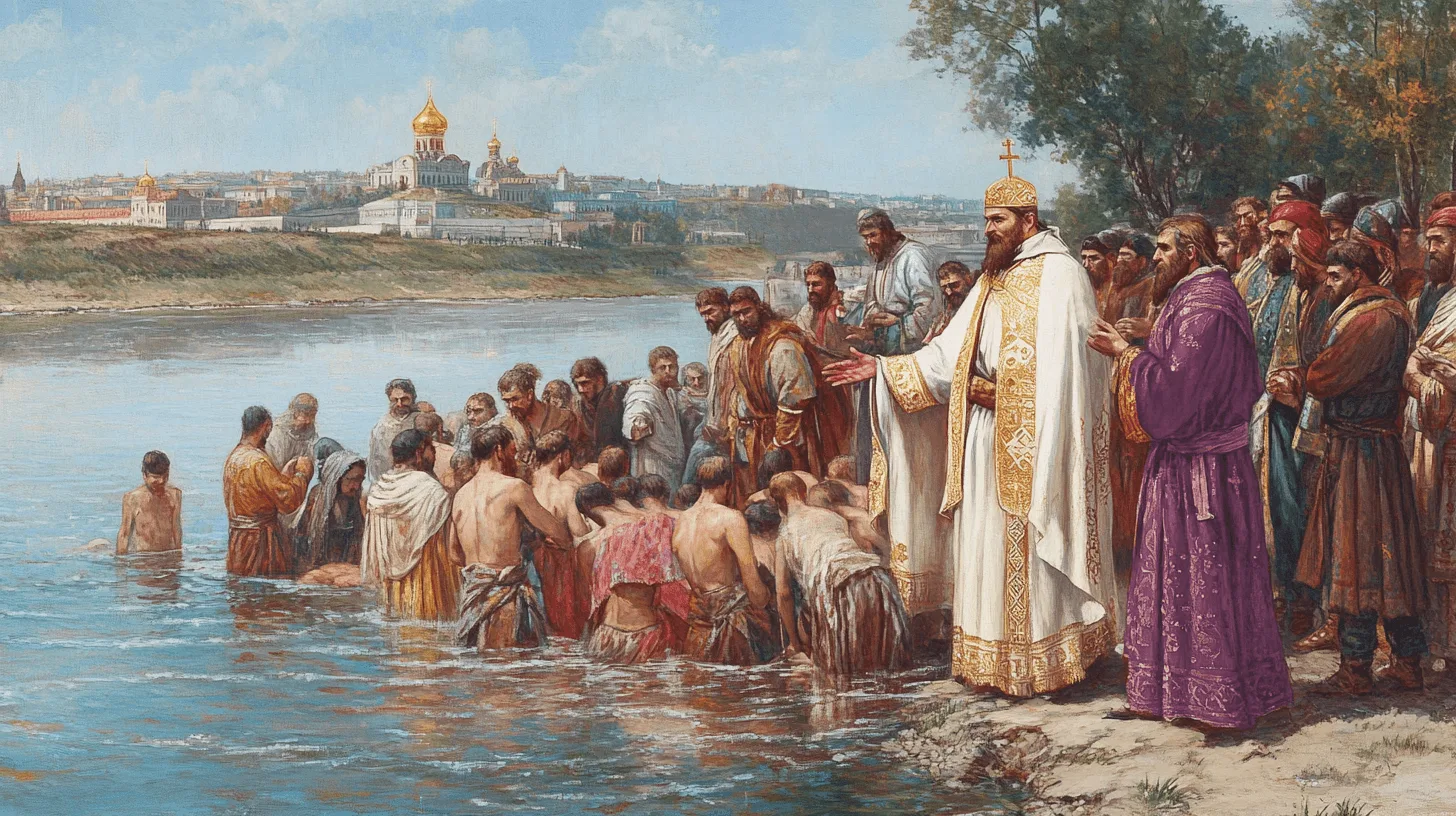 The Byzantine conversion of Russia to Christianity marked a significant cultural and political shift that would shape the region for centuries to come.It was a long and slow process that culminated in Vladimir the Great destroying pagan temples and organising a mass baptism of the people of Kiev in 988 and leading to the adoption of Orthodox Christianity as the state religion of the Kievan Rus.