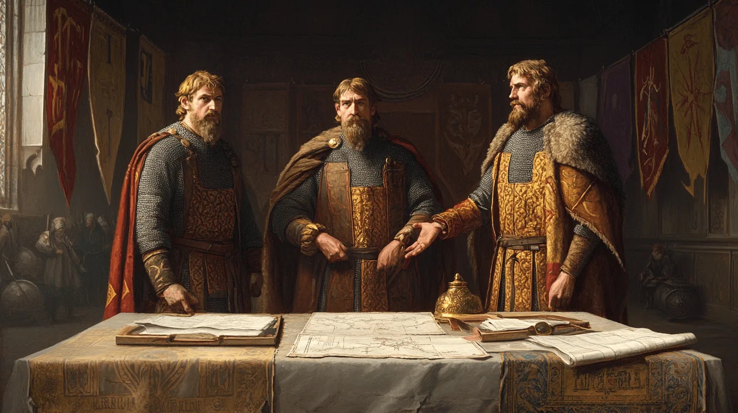 Charlemagne’s grandsons – Lothair I, Louis the German, and Charles the Bald – fought amongst themselves after their father’s death in 840. After nearly three years of continuous warfare, the warring brothers recognized the futility of further conflict and agreed to negotiate a settlement. The Treaty of Verdun, signed in August 843, divided the Carolingian Empire into three distinct kingdoms which established the development of the modern nations of France and Germany.