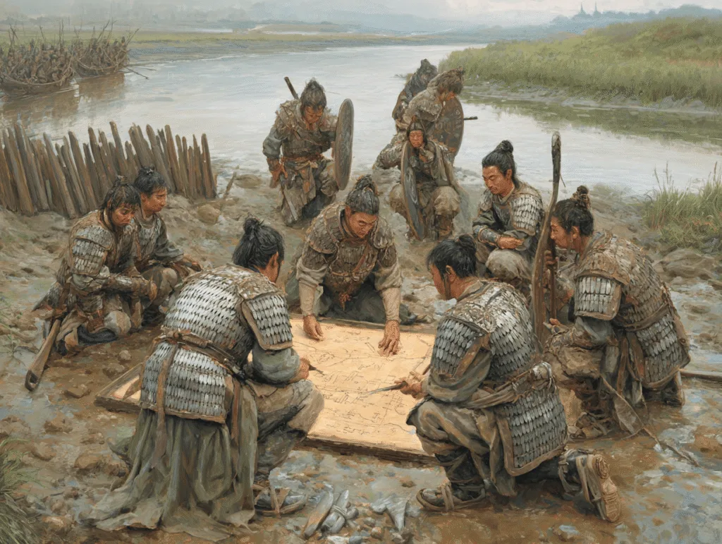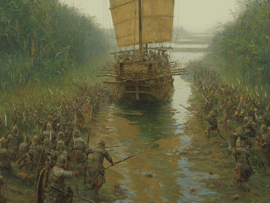As the Han navy advanced upriver, their warships moved confidently into what they thought was a straightforward river assault. Ngo Quyen deliberately allowed them to progress upriver, feigning weakness and retreat.